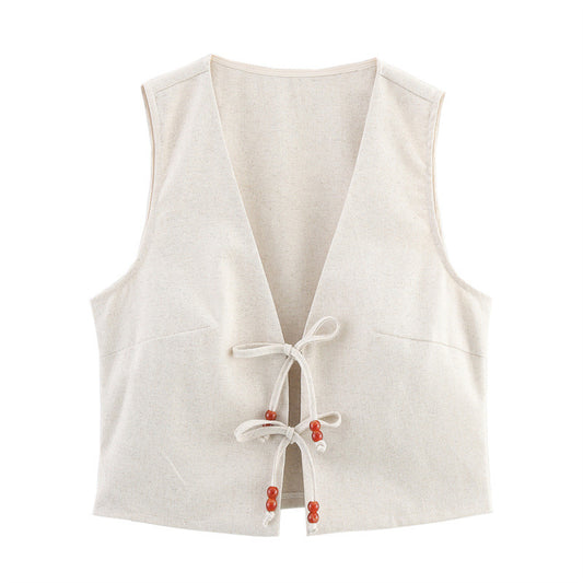 All-match V-neck Beaded Lace-up Vest Beaded Lace-up Solid Color Skirt Skirt Suit